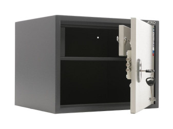Верхняя секция оборудована запираемым кассовым отделением, нижние секции — съемными полками. Общая вместимость шкафа — 17 папок-регистраторов (60 мм) под документы формата А4 типа Корона, Bantex и т.п.